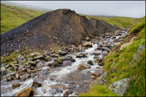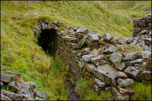 Fortunately there was an adjacent wall so I had to do another balancing act and walk along the top of the wall. My first objective of the day was to visit an old mine level adjacent to Middle Tongue Beck. When I got to the beck it was swollen with the recent rains and too deep and wide to get across. I carried on up the beck and hoped that I could get across at the mine. I saw the spoil heap up ahead and when I got there just managed to jump across without incident. The ruined mine buildings had been quite large and the tunnel entrance going into the hillside was still open but a metal grill had been fixed just inside. |