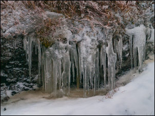 The road was very icy and I was glad I was on foot and not the bike. After a steep climb up to Scotchmeadows the gradient eased to Meadow Cottage then it was a steady plod up Shivery Hill. On the way I stopped briefly to look at the bridge across Doctor’s Hush. The base if the bridge was crumbling concrete with a parapet wall of stone. A date stone on the parapet said 1930. |