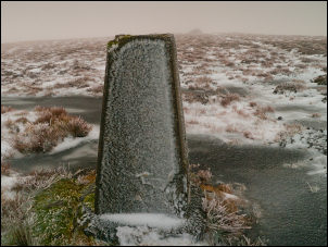 This turned out to be the correct spot and it seemed such a pathetic way to mark the junction of the counties of Cumbria, Northumberland and County Durham. The next objective was Killhope Law summit and its trig post. With no boundary fence to follow I had to continue with my magnetic compass. It was rough and boggy underfoot but the big advantage of the sub zero temperature is that the ground was mostly frozen. |