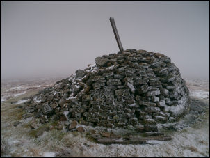 I was still in mist so after having a quick look at the trig post continued to a partly collapsed currick, or pile of stones. |