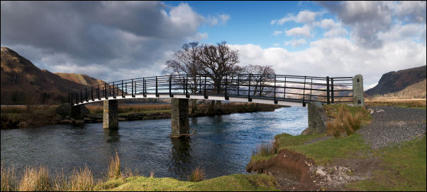 There are several paths in the area but I kept to the one through Mossmire Coppice and on down to High Lodore Farm. I rejoined the road and just past the Borrowdale Hotel took the path across fields to the footbridge across the River Derwent. |