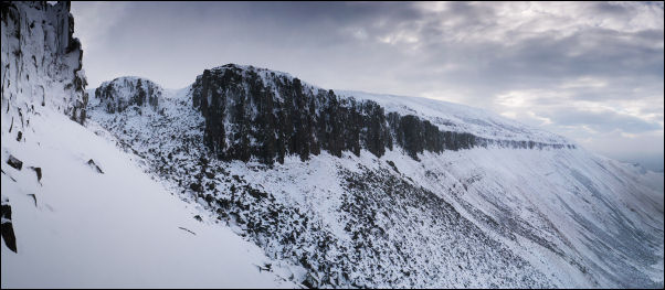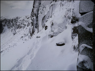 I reached it at the line of and old stone wall. On larger scale maps it is shown as a dash line, almost exactly the same as a path. My Garmin GPS has Topo maps loaded and the wall line is clearly labelled as a path. The head wind was making the going tough. I could see the snow plastered rocks of High Cup Nick ahead but is seemed to take ages to get there. I took advantage of some shelter behind a large boulder to have my butties then continued into the wind. The climb up wasn’t as difficult as it looked from a distance. Near the top there was a nice traverse in deep snow which took my up the final gully. As soon as I got on the summit plateau I knew I had to get down as soon as possible as it was very difficult just standing up. |