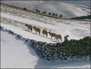 The good thing was that I descended by the main path along the NW edge of the valley and I had the wind behind me. The snow had obliterated the path but quad bikes had been up and left their trails. Some sun began to shine through at times but it remained cold. I hadn’t seen any walkers all day but as I walked down the walled track near Dod Hill a farmer and quad bike came by. Shortly afterwards there was another. Back in Dufton the weather had brightened up a bit. |
