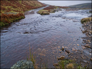 I was now on Harnisha Hill but don’t have any idea why it is called that. I climbed the fence and headed roughly south across featureless moor. I was still in thick cloud so had no views so missed the curricks shown on the map. When down to 480m I dropped below the cloud and had a gloomy view of the valley below. |