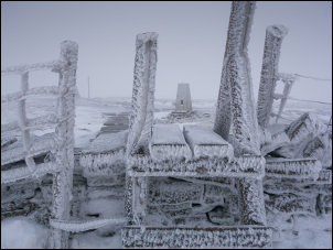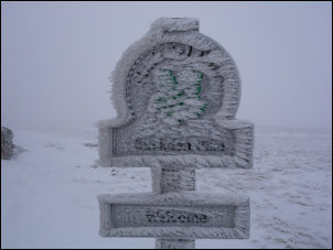 Towards the summit the fence ended and a wall took over. At the top a frozen stile took me to the Buckden Pike trig post. Everything was covered in ice so I didn’t hang around. Continuing south I came to the memorial for a crashed plane. It was a Wellington Bomber that crashed on a training flight on 30 Jan 1942. There was only one survivor, Sergeant Joe Fusniak. There was little to see in the thick and freezing cloud so I continued down to the 1810 marker stone. |