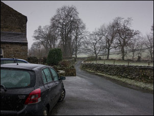 I turned left through the Hard Rake Quarries area where several piles of stone can be seen. The map shows a path continuing but there is nothing on the ground. The line of the path is very vague on the map and couldn’t find any sign of it. I headed down Fosse Gill below Walden Moor and skirted round the contour line to eventually find the path above Deepdale Gill. I reached the valley bottom at Walden beck but once again the path on the map is completely wrong. The first proper path sign I saw was on the opposite side of the river. I followed it through boggy fields to eventually reach a bridge then a track to Kentucky House. I was now on the tarmac adopted road at Temple Lane but the snow was making is slippery going. It was only a thin layer of slush but kept building up on the soles of my boots. It was a wet walk back to the car. |