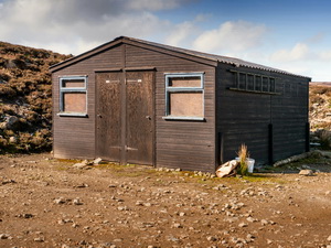It was easy walking and the views were good, in spite of distant haze. The map showed me passing through the wonderfully named area of The Swangs but I couldn’t see anything that would justify the name. Just over the summit of Larchet Hill the track ends at a turning area with a hut in the corner. All the windows were covered and door locked. One reason I’d come this way was the map showed a chimney. There was no sign of one but a pile of stones and a carn in the middle. There was no sign of any evidence of mine workings so a chimney didn’t make sense. My continuing route was west, following the wire fence line. |
