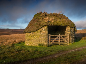 It was an interesting viewpoint but the previously clear weather kept clouding over. I managed to find the track I was looking for and headed over East Harts Hill where I got a good view of the distant obelisk on Cracoe Fell. I wasn’t going that far so continued along the track to an interesting shooting hut with earth roof and open front. |