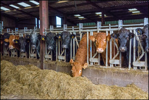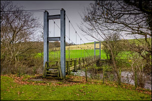 | I went back to my original plan and set off to drive north. I reached Chapelburn and parked my car in the small lay bye next to the telephone box. The path left the road and headed between some buildings and down a wet and very muddy field. I crossed the River Irthing by a substantial metal suspension bridge then turned right towards Lanerton Farm. |