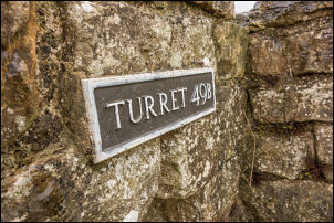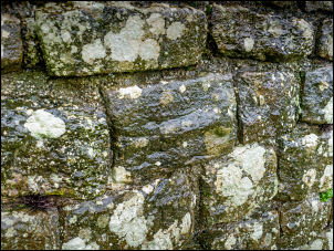 | On the way I noticed a stone post in the river bank with an inscription. I couldn’t read what it said but it wasn’t old enough to be roman. I walked through the farmyard which was very tidy and clean and as I reached the steep uphill farm track a truck drove down. It was a Fallenstock vehicle and was there to remove a dead sheep lying by the gate. Up the track I reached the line of Hadrian’s Wall vallum ditch. It was now raining quite hard as I followed the path by the ditch. Shortly before Birdoswald I reached a very substantial length of stone wall. 12 metres before the remains of Turret 49B I found the stone carving of a phallus on a stone on the top course. |