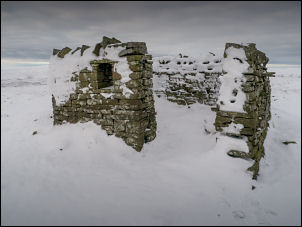 | I stopped at the old quarry building, which was roofless but gave me some shelter from the cold wind. The cloud was low but I had good views below it. The continuing rack vanished after a while and I had to cross deep snow across open moor summit of Fendrith Hill and the trig post. Away to the west or southwest I could see the distant hills of Cumbria. |