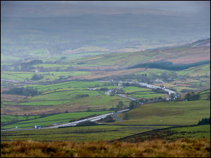 | Fortunately for me a section of wall had collapsed and I was able to get through and reach the trig post without problems. It was an extremely good viewpoint with the A66 road below. Distant cloud prevented far distant views. I wasn't sure of the best route to take for my descent as it was a steep descent and I could see that the area of great Moss below was going to be very difficult to get through. |