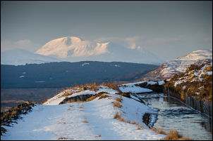 | This was good news as it meant I probably wouldn't have to negotiate any drifts. At the track I found a tracked vehicle had been through and it was relatively easy to walk on. As I descended I was surprised to see areas of tarmac when the snow had started to clear. I reached a dam and reservoir which presumably are part of the power station operation. There was still a few miles to go to reach the road but it was easy going and no problem. When I got below the snow line the track seemed to deteriorate a bit and near the road was covered in a lot of mud. I reached the road and an easy walk back to the car. |