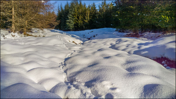 | I followed it for almost 2 miles until the track ran out. The aqueduct continued but I had to leave it here as the next part of my route was up through the forest. There had been a lot of snow on the track so far and as I climbed the snow became deeper and very difficult to get through. I have never used proper snow shoes but I'm sure they would have helped me out. I pressed on but began to have doubts about being able to make it if the snow continued at this depth. My only escape route was to retrace my steps. At the boundary fence I climbed a full height ladder fence to get over then out on to open hillside. The sun was up but there was snow as far as I could see. |