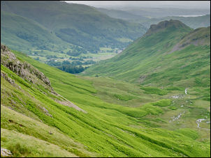 | I’d seen a path up Steel Fell shown on the Open Street Map website that isn’t shown on the Ordnance Survey map and decided to check it out. I left the road by climbing a stile over the fence and straight up the fell side. I could see a path ahead and even though it looked indistinct higher up it turned out to be OK the whole way up. It also gave a nice view back down to the Dunmail Raise summit and large mound of stones that is actually the Dunmail Raise large cairn that gives its name to the pass. |