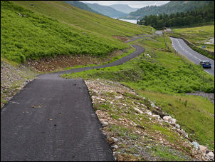 | I reached the minor Thirlmere road at Stockhow Bridge and turned right to reach the main A591. There is no path along the A591 so I crossed over to follow the single track road that was tarmacked earlier in the year to take buses around the repair works. It is also the original route of the A591 and the length that collapsed was built around the 1930s. On the track the stone bridge had been strengthened by putting a steel bridge over the top. At the next steel bridge I crossed Birkside Gill and turned north to reach the repaired section of road. I tried to re-take photos where I’d taken them in Jan 2016. I had to walk back up towards Dunmail Raise along the busy A591 and had to be very careful of fast vehicles approaching. Thankfully I was soon able to climb the wall and join the original path that had now been surfaced with tarmac to act as a cycle track. I followed it back to the summit then back to my car. | |