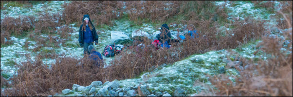 | I reached Hay Gill and the ruins of the old smelt mill. I looked down from the track to see several young ladies and nearby bivvy bags. On the opposite side of the track were several young men with similar bivvy bags by the sheepfold. They had all slept out overnight in the sub-zero temperatures. I noticed what looked like their instructor below. |