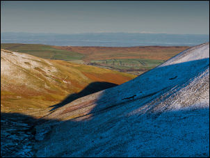 | This happened at every step. My next objective was the summit of Knott but the going was so hard I decided to head west instead towards Great Sca Fell. Occasionally I found some snow that would take my weight and the walking was easy. The sky was clear and the views made up for the misery of getting through the snow. I was hoping that when I reached the main track on Little Sca Fell I would be able to follow the tracks made by previous walkers. |