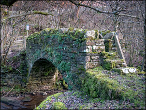 | The fields were extremely wet in places and with footbridges I'm always unsure whether they exist or not. I reached a steep descent which took me down to the river and was pleasantly surprised to see a substantial stone bridge across. It was similar construction to an ancient pack horse bridge but seemed much newer with stone blockers at both sides to only allow pedestrians across. |