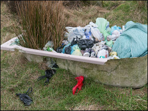 | Here I turn right then fairly soon turn left to follow the road up to Winter Hill transmitter mast. Part way up was an old abandoned bath which dog walkers have been using to dump in bagged dog excrement, absolutely disgusting. It was very misty and I couldn't see the mast at all until I was almost there at the base buildings. |