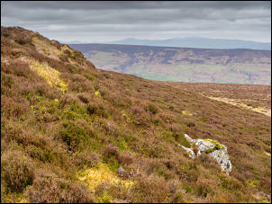 | The pile of stones look ancient but the maps make no mention of them. Away in the distance I could see the outline of Cold Fell and the pile of stones on top. I headed to it across rough and went ground with no path to follow. On Cold Fell summit it was 3degC and still overcast but there were still distant views. |