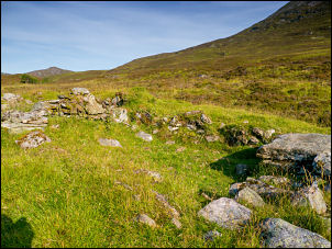 | I came to another group of shieling remains and was able to cross the river without any problems. Up to the southwest I could see Glenmore Bothy and headed straight for it. The going was a bit rough in places as I didn’t have a track to follow. The bothy was substantial, in excellent condition and unlocked. There were two rooms downstairs and two sleeping areas upstairs. |