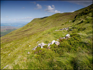 | The first steep bit was quite easy as it was soft short heather. I continues to the observatory site and placed a marker cross of toilet roll held down with stones. The reason was I wanted to be able to identify the site from the road and there was nothing of note to see seen. The thin paper would soon deteriorate when the rains came. Once down to the road I could see the cross through the binoculars. It was then an easy walk back to the car park where most of the cars had left. |