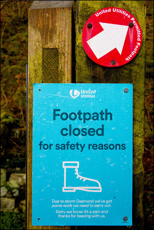 | It was easy going until I reached the forest fence. I was able to cross the gill without any problems and the fence was fairly low and that didn’t present a problem either. There was no obvious path down by the waterfalls and Launch Gill and I had to climb slightly before finding a dafe way down the steep bank. Near to the waterfall I reached a faint path which headed down. It only goes to the waterfall and descends to the road below. It is only for sightseeing and had no direct connection with the fells above. As I descended one section even had wooden handrails. At the bottom of the hill adjacent to the road was a sign saying ‘Footpath closed for safety reasons’ blaming it on Storm Desmond which happened in Dec 2015 and from what I could see of the path nothing had been done in the intervening 2 years. |