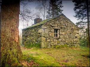 | At the road I turned left to head north along the road back towards my car but intending to check out the lower length of forestry road to see if the bothy was there. I met a man out walking from the caravan park at Bridge End Farm. He said he’d seen film crews presumably with news teams about the Thirlmere zip wire proposals. He continued and I headed up the forestry track and soon came to the bothy also known as Countess Ossalinsky's Summer House. |