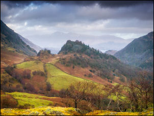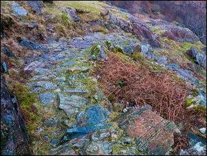 | I stopped for a while to take in the view north of Castle Crag and Borrowdale. It looked spectacular even in the gloomy weather. The descent path to the next track was very wet and slippery so I walked on the grass and ferns wherever possible. At the main track I turned right for a while then up an indistinct track to the left heading for the old Rigghead Quarries. |
