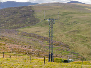 | The views were extremely good out to the Solway Estuary where I could clearly see the Scottish hills in the distance. It is fairly strange that the Ordnance Survey doesn’t show a path running over the summit yet the online open street map site does. I continued directly east along a gentle descending path heading towards an interesting looking aerial mast. The path continues past it but I stepped over the fence to have a closer look. There is a substantial power supply into it and looking at the microwave dishes it looks like a relay station. |