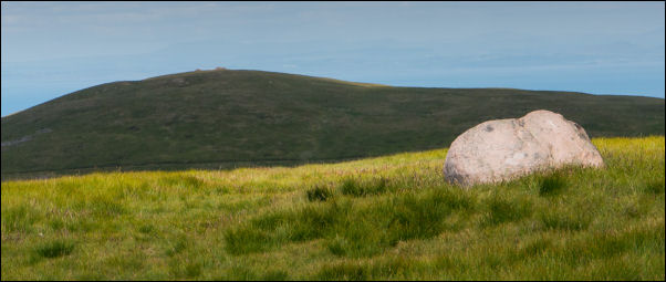 | Part way up I turned sharp right across open more heading for Whoap. I soon came to a faint quad track and that led me to a faint path which took me gently up to the large summit area at just over 500m. There is nothing of note on the summit other than a large boulder to the west which isn’t quite at the highest point. I visited the boulder then returned the way I’d come to swing round to the right and descend to the saddle above Red Gill on my way up to Lank Rigg. The climb up to Lank Rigg was relatively steep. At the summit trig point I had a partial view of Sellafield to the southwest and a cairn in the way to the south west near a tarn. There is an interesting and amusing tale in Wainwright’s book about buried treasure on Lank Rigg.: |