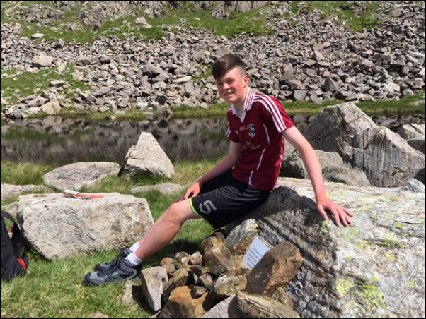| There are also some boulders in a circle indicating previous camps by others. I headed to the tarn for my next objective. I was here in Nov 2017 and came across a memorial in a boulder to the memory of 19 year old Paddy Bird who died on the spot on 14 June 1966 while attempting the three peaks challenge for charity with his friend Kevin Prendergast who also died. Paddy’s brother had contacted me about the memorial he’d seen on my Nov 2017 post and sent me a photo of the memorial with his son, also called Paddy after his uncle. |