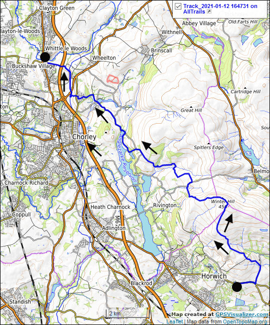Walker Fold Road (Horwich), Winter Hill, Noon Hill, Old Rachel's, Manor House, Great Knowley, Lancashire. Tue 12 Jan 2021