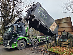 a large vehicle was dumping wood chippings into a large